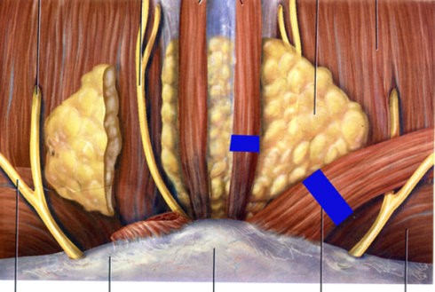 对应于40岁以前皮肤不是很松弛,但额部的横纹,眉间纹及鱼尾纹较明显,尤其是在做笑或怒的表情时的动态皱纹,可以选择做微小切口的内窥镜除皱术。在额部发际线后作2-3个小的切口,长约1.5--2厘米(图1术前,图2切口,图3术后 ) !分离后伸进内窥镜镜头,内窥镜里面的微型摄像机将深面的精细结构清晰地呈现在监护屏幕上,利用其它特殊辅助器械找到并切除部分“皱眉肌”“降眉肌”及“额肌”(图4:蓝色部分表示切断的额肌;图5:蓝色部分表示切断的皱眉肌和降眉肌)