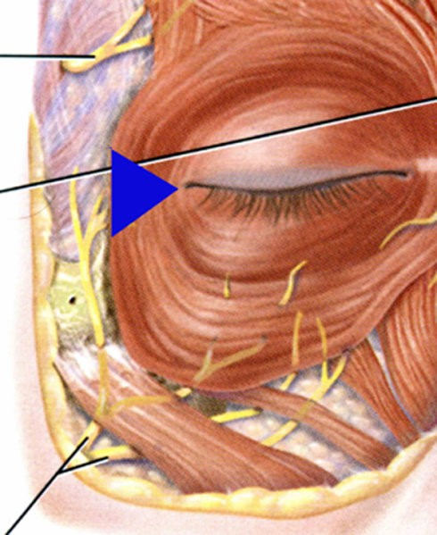 其次才是提紧皮肤,上提眉毛,为“治标”。内窥镜额部除皱时不去除多余皮肤,故皮肤上提的幅度有限,一般不会超过“冠状额部除皱术”皮肤提拉的幅度。内窥镜额部除皱也可和内窥镜颞部除皱术同时进行,此时在颞部(太阳穴)需增加小切口!内窥镜颞部上提术的目的是切断部分眼轮匝肌(图6),消除“鱼尾纹”;