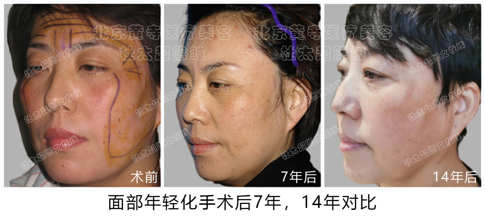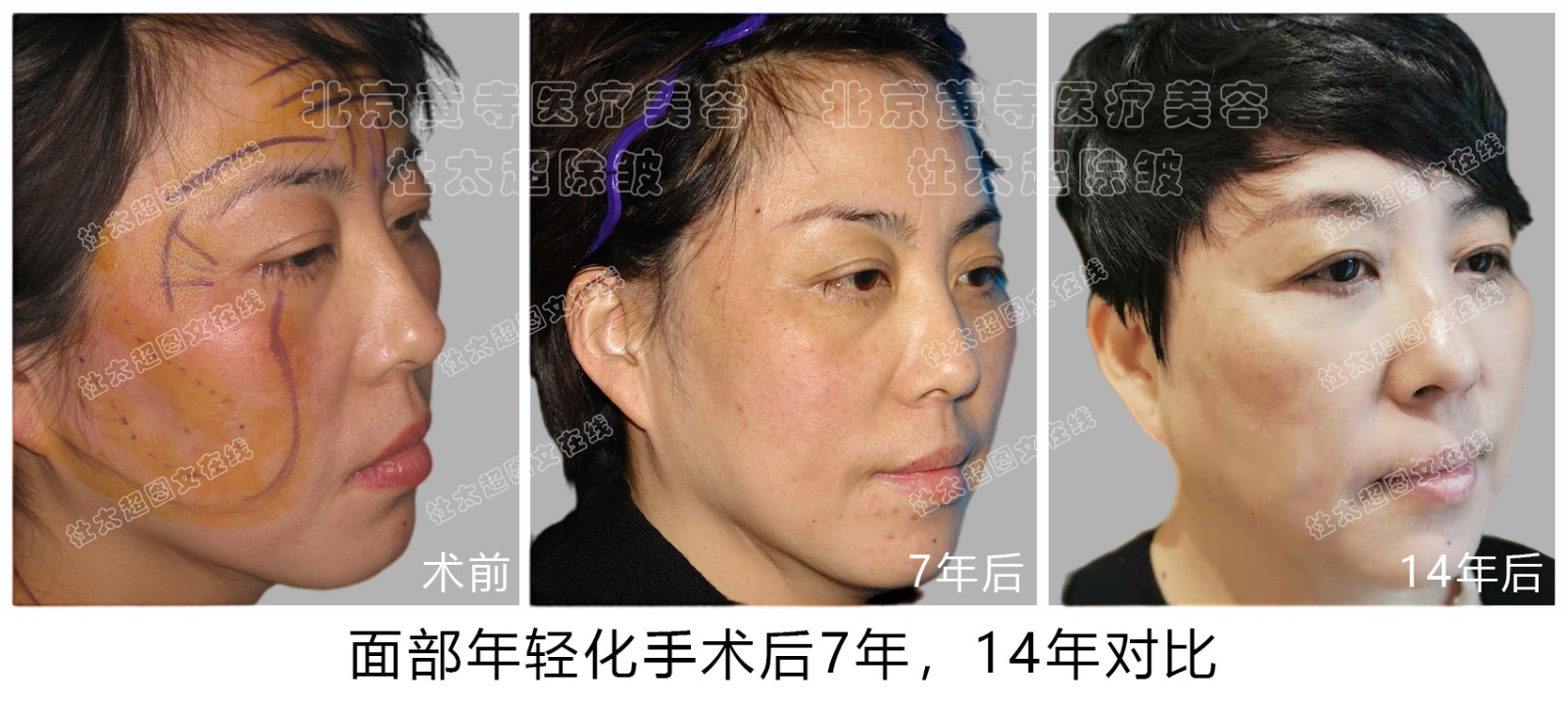 求美者 面部年轻化 额纹,川字纹去除,上睑松弛提升眼袋 中下面部颈部下颌缘提升 术后随访7年和14年--经典案例