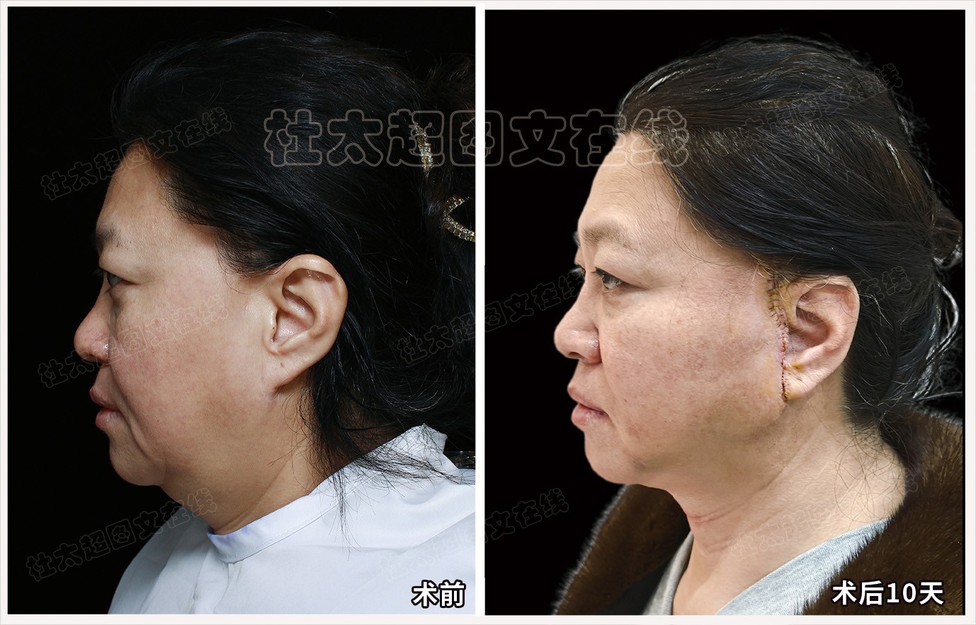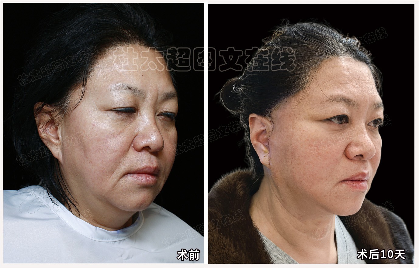 馒化中年人拉皮面部提升术后近期随访10天(不能用)