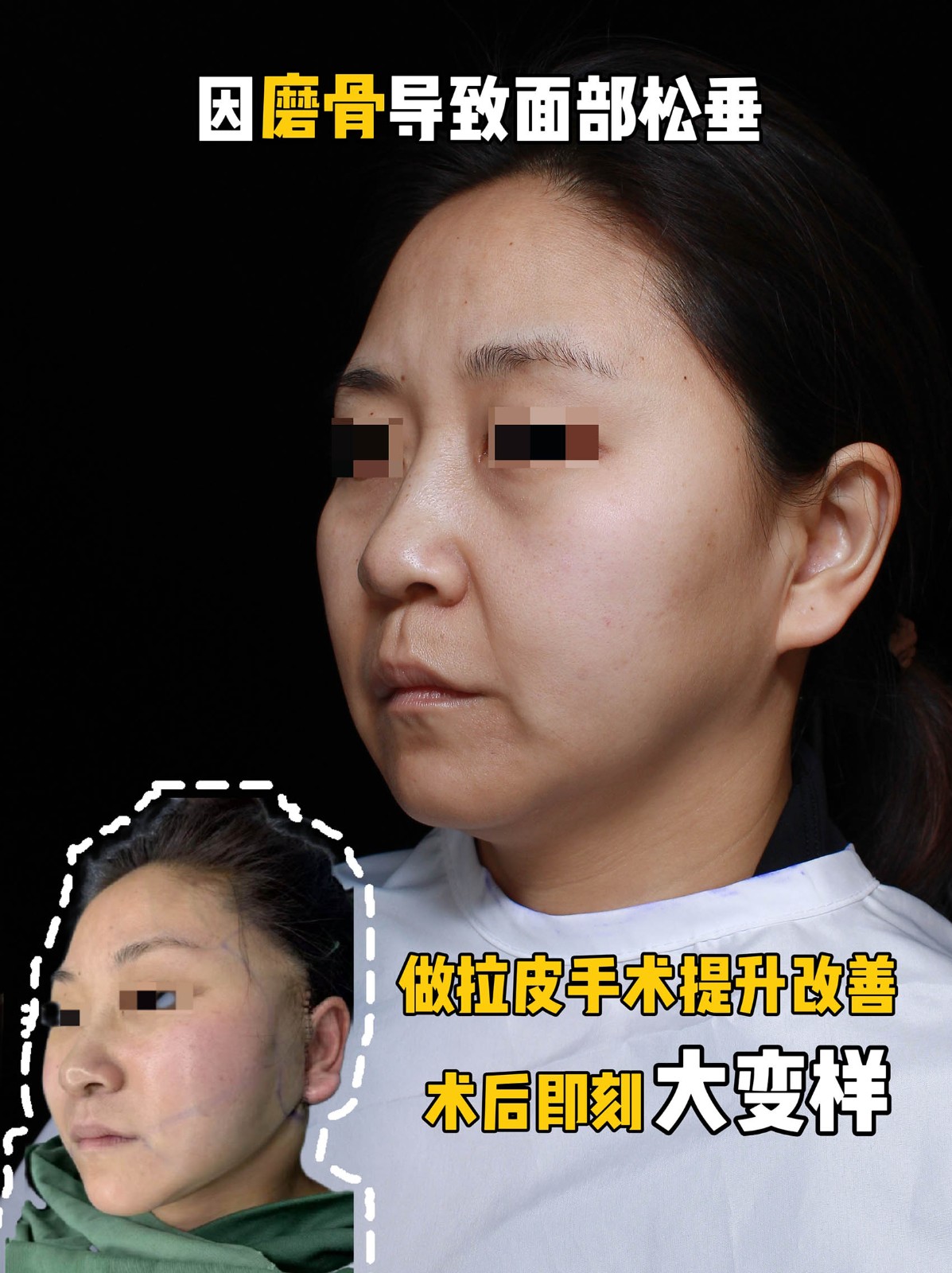 因磨骨导致面部松弛,做拉皮手术改善,术后大变样!