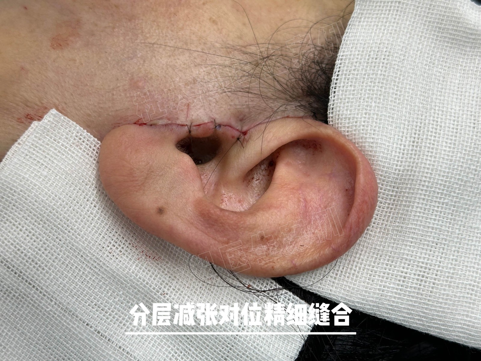 下图是我们切口缝合(分层减张对位精细缝合)后状态,在表皮未完全缝合的状态下,切口几乎无张力,这样的缝合,术后才不会留疤留痕!