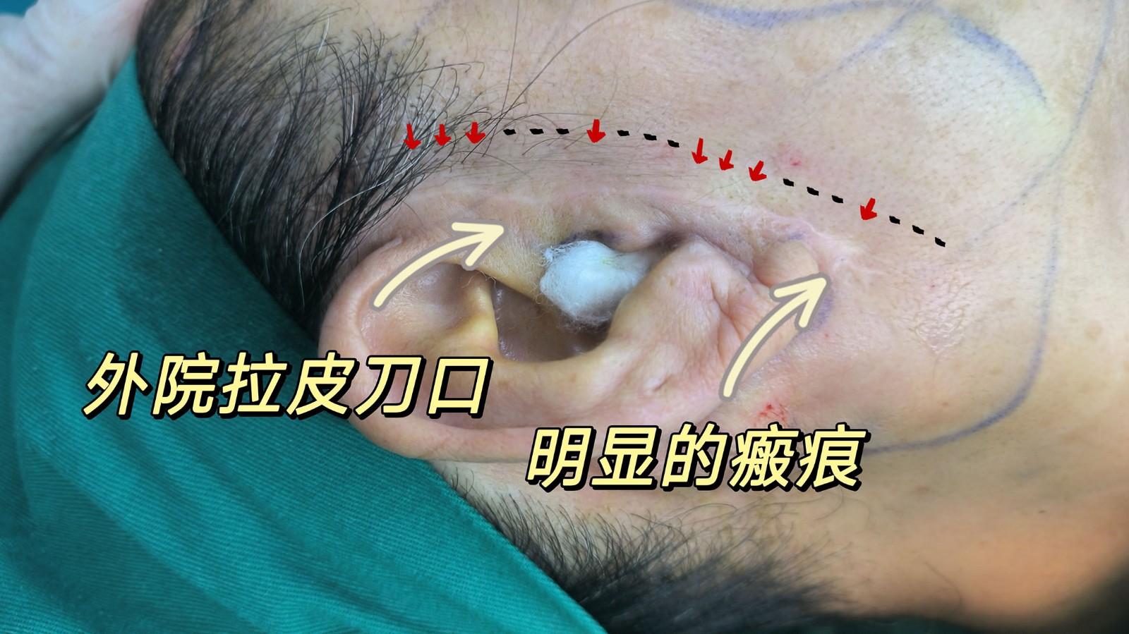 专业的拉皮耳前切口最好是做隐蔽设计,在耳垂皱襞内到耳屏脊处,切口不明显,可以有效规避恢复期的尴尬阶段。而图中的切口,明显是在耳前1cm处做切口,切口暴露,且留有明显疤痕。这显然是非专业医生的作品。