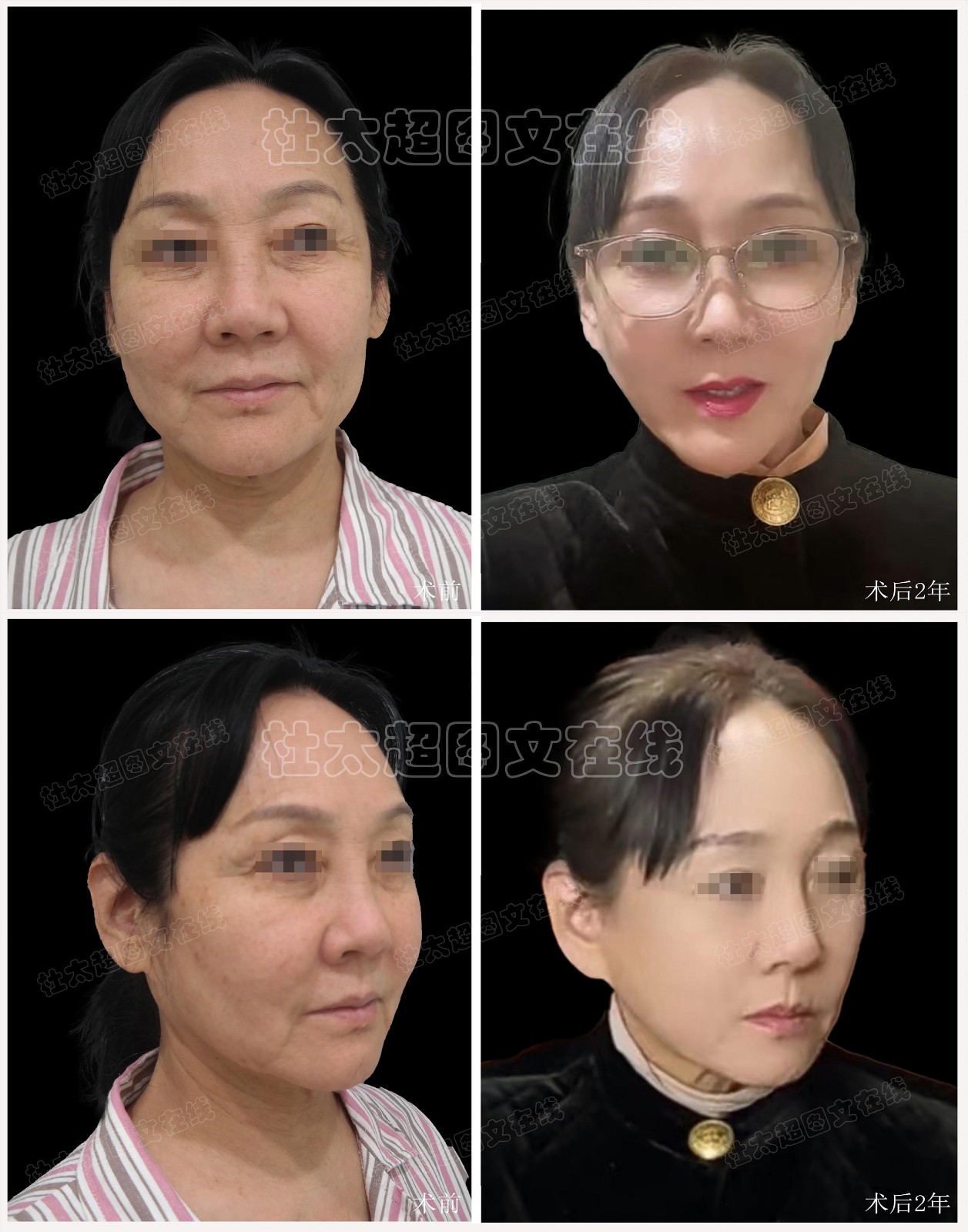 侧面看,鱼尾纹、面颊凹陷明显,轮廓下垂,颈部松弛明显。