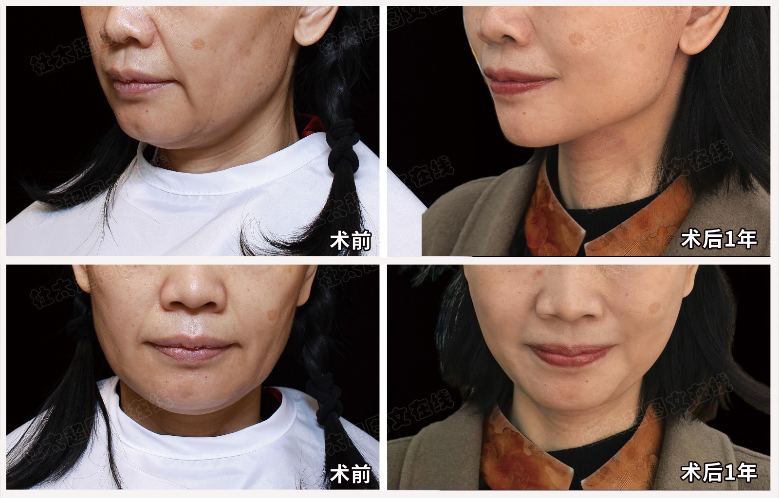 2、轮廓的改善。拉皮术后,面部轮廓变紧致流畅,双下巴明显消失,整体更年轻态。