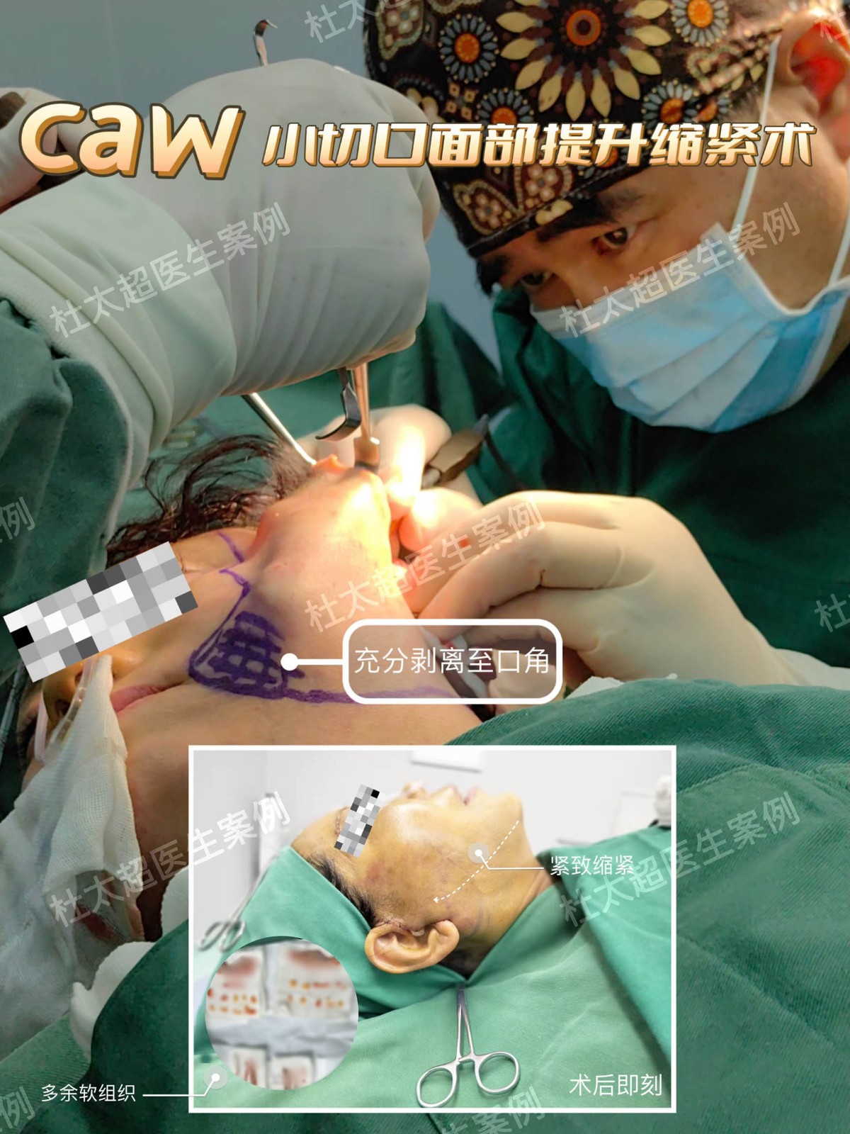 操作围绕 SMAS 层展开,精准的操作,既保护血管神经,又能分离下垂的苹果肌、下颌线。凭借经验丰富的解剖知识,精准控制范围和深度,持久性远超传统大切口拉皮。