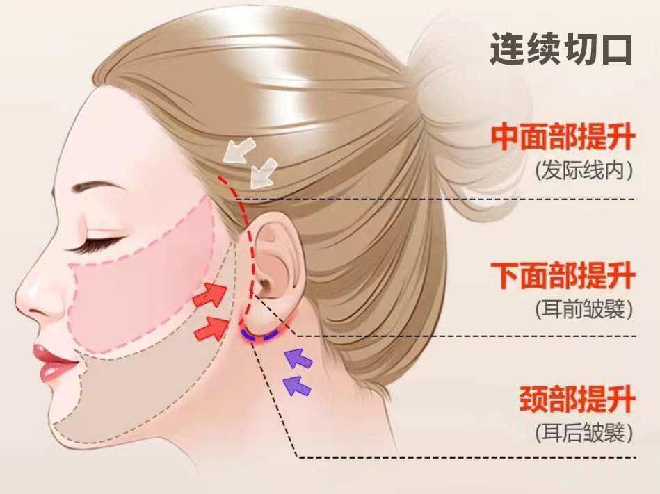 其一,切口位置:进行拉皮提升时,我会选择在发际内、耳孔缘附近、耳垂隐沟等隐蔽位置做切口,这些地方顺着皮肤纹理,痕迹可以隐藏在耳垂皱襞、头发里,与周围的皮肤褶皱重合,能最大程度地掩盖痕迹。