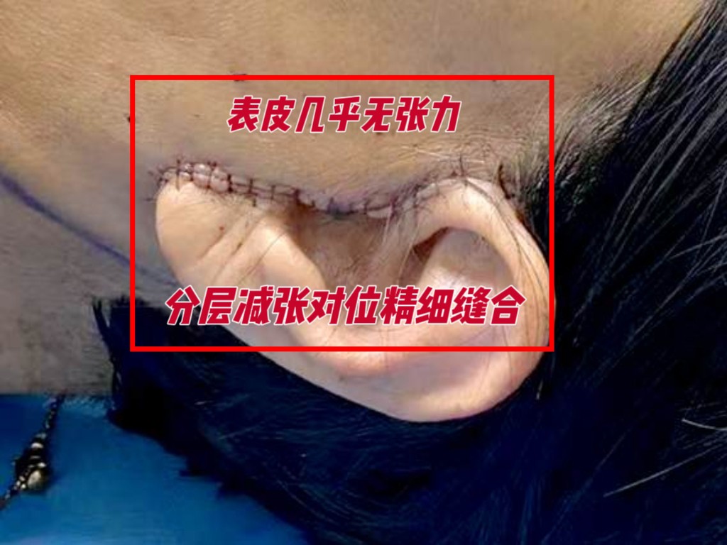 其二,减张缝合:我采用的分层减张对位缝合技术,从深层到浅层逐层向上缝合递减张力。到达最表层的皮肤时,切口所承受的张力已被降至最低,确保了皮肤在几乎无张力的状态下愈合,最终留下的痕迹,肉眼几乎看不见,真正做到了“减张即减疤”。
