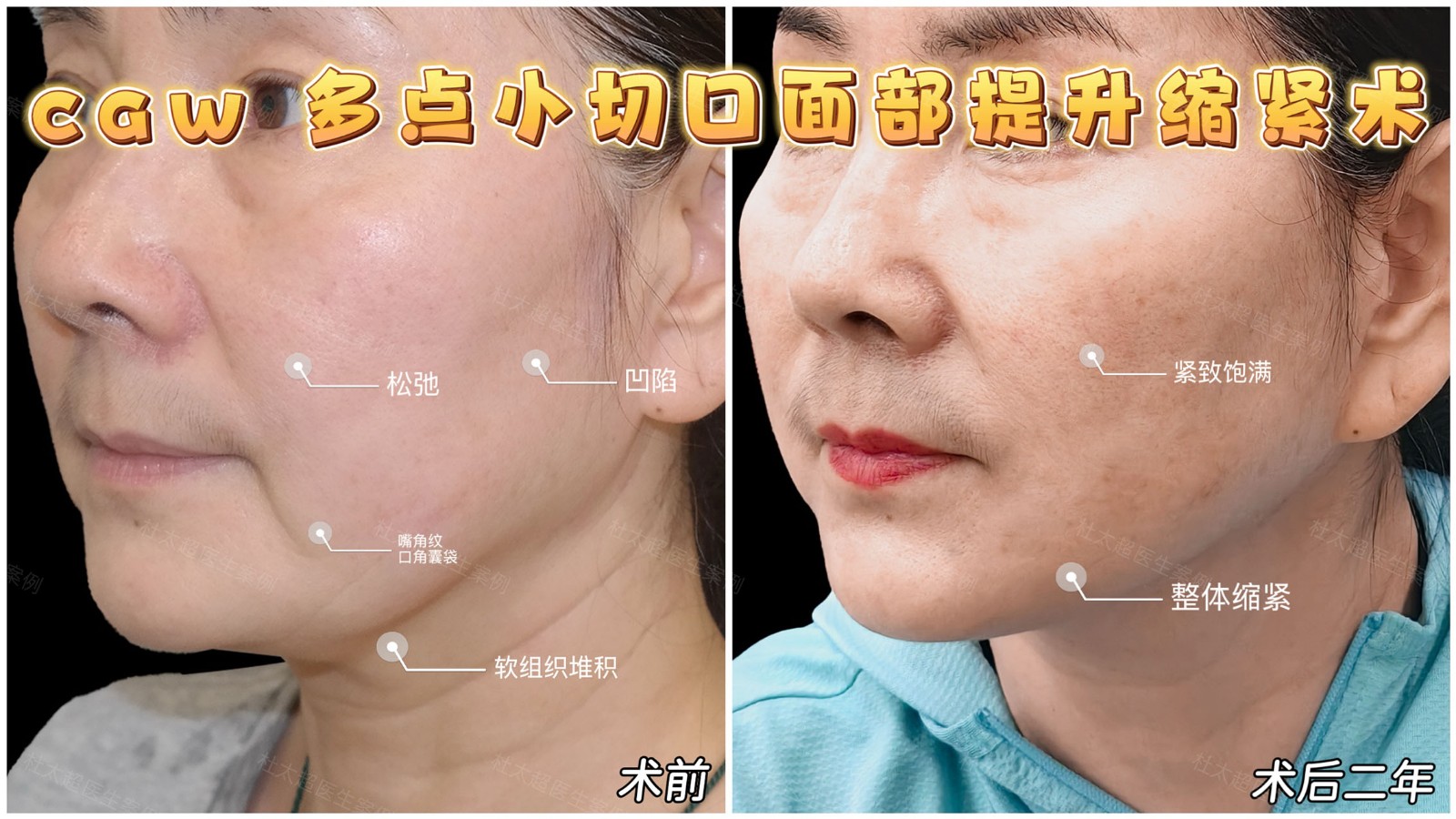 caw多点小切口面部提升缩紧术效果显著。术前面部有松弛、凹陷、纹路及软组织堆积问题,术后二年实现紧致饱满、轮廓缩紧,经长期验证,以微创精准优势,持久抗衰,重塑年轻态 。
