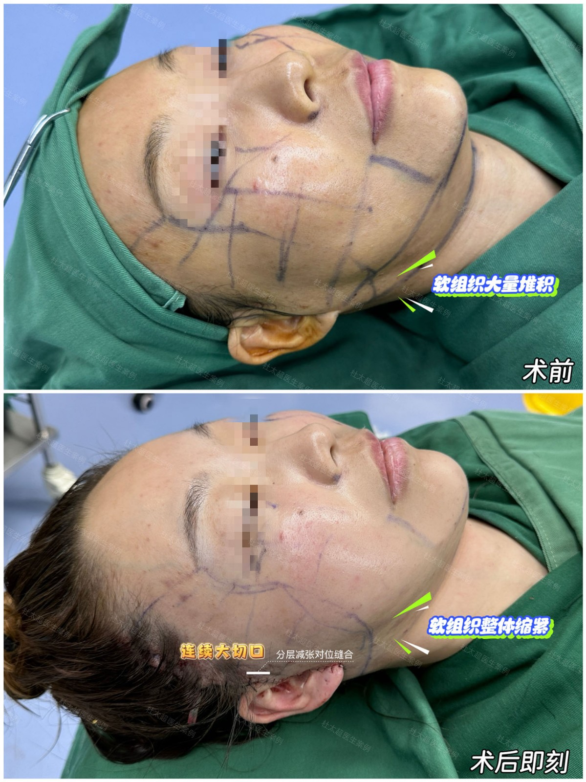 因松弛严重需做连续切口,通过分层减张对位缝合 ,精准提拉复位软组织,实现术后即刻整体缩紧的年轻态!