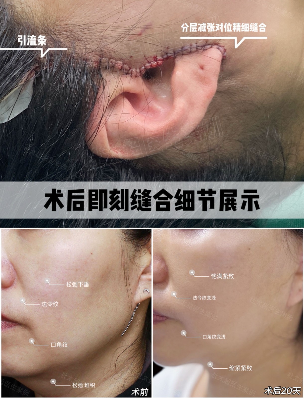 术前面部松弛、法令纹等问题明显,术后20天,靠分层减张对位精细缝合,恢复后瘢痕不明显,面部饱满紧致,纹路变浅,效果惊艳 。选医生别只看提升,缝合细节和案例得重点考察,才能实现好蜕变~