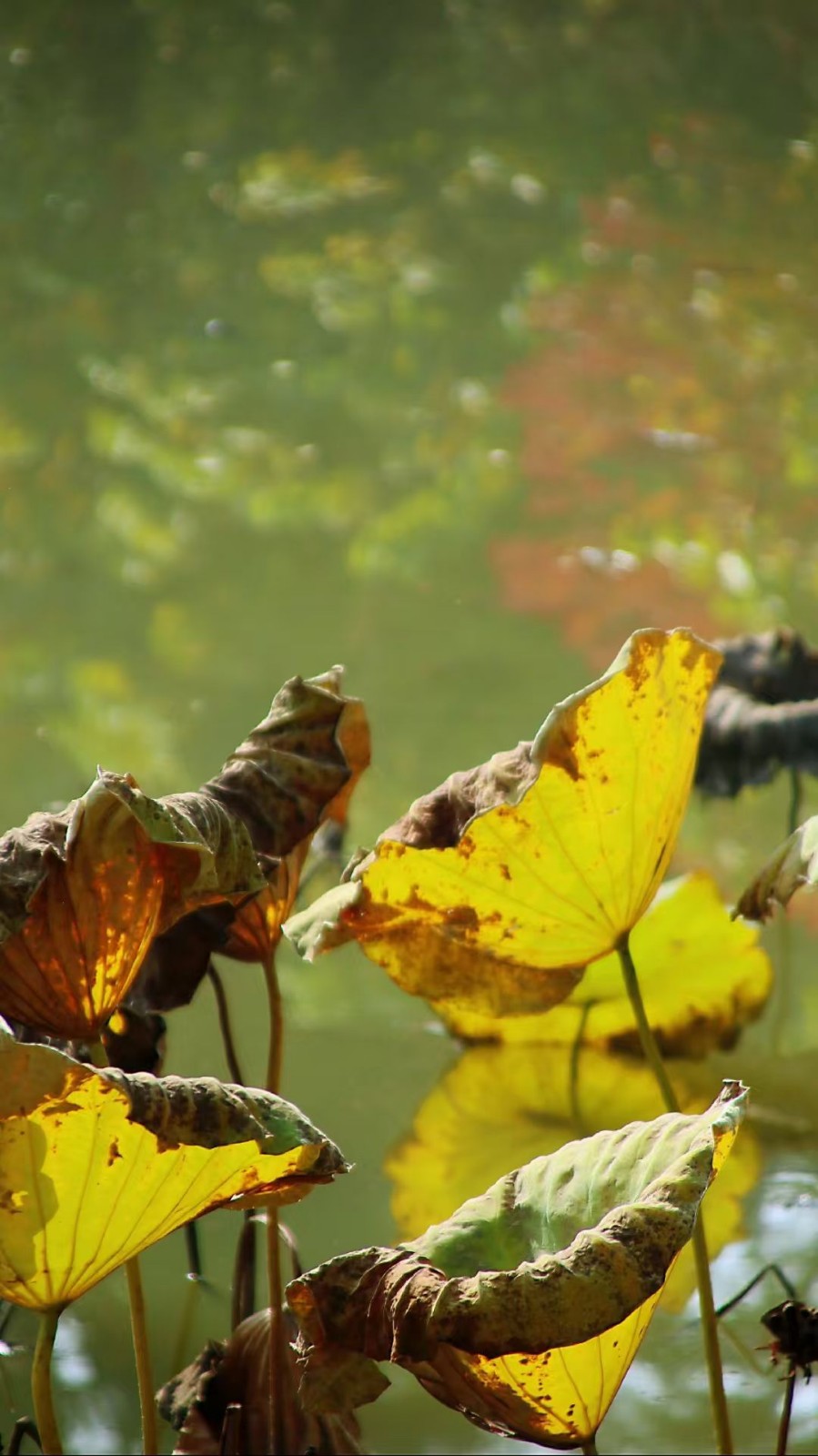 秋池里,晚风涤荡,荡起层层细浪,随着波纹将向晚的霞光扭曲成玲珑般的幻光,水中摇曳的莲荷吐尽最后的绿色,在点点滴滴的浅黄里报晓着秋色的来到。