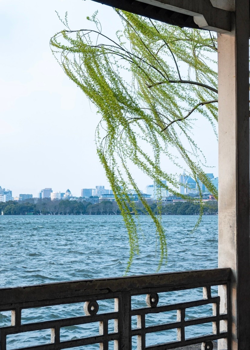 一阵风起,在荷塘岸边的杨柳随风起舞,宛如那一身绿纱的少女翩翩起舞。
